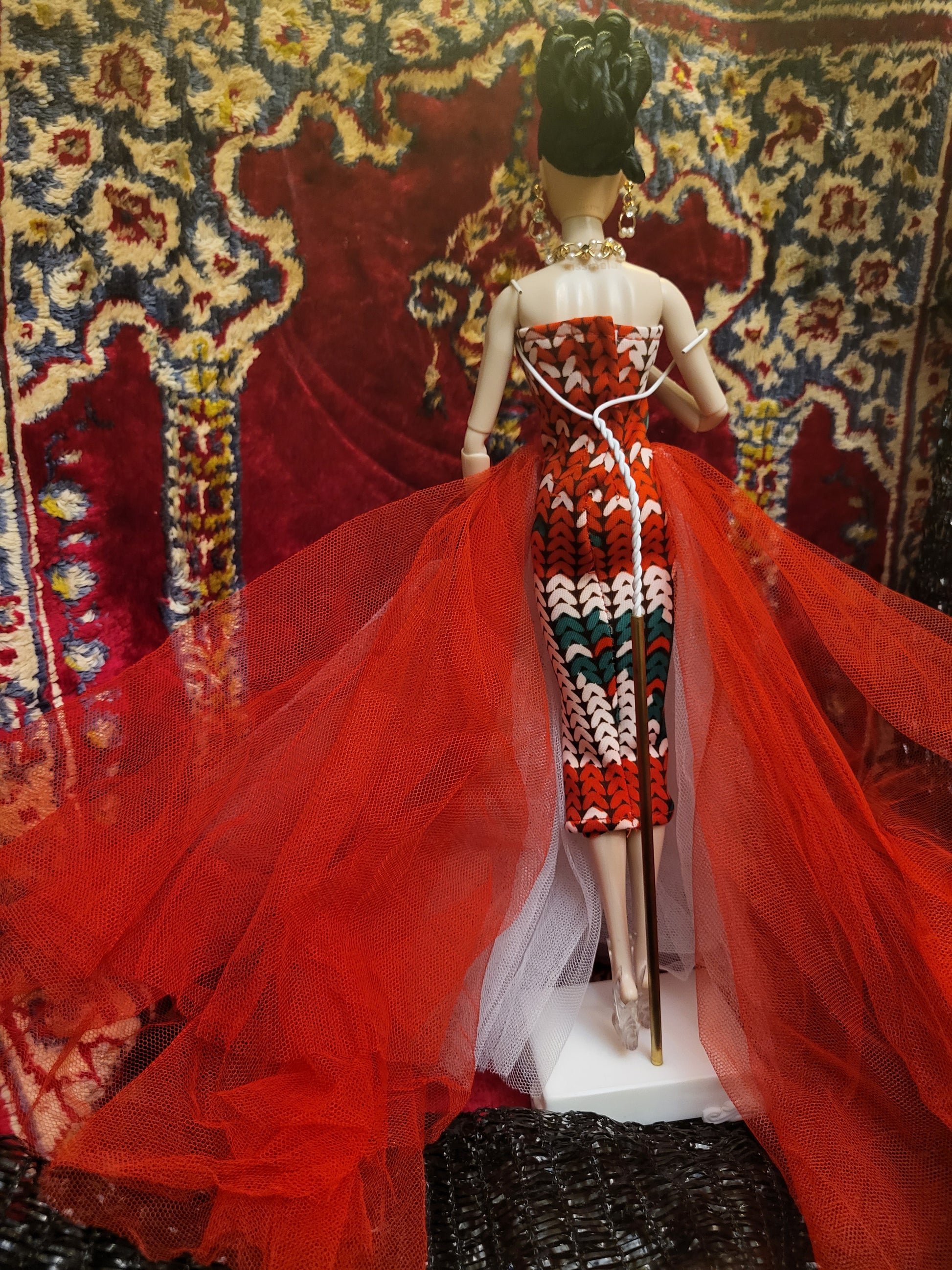 Fashion gown for Barbie, FR, Poppy Parker dolls. The Red gown is being modeled on a 12.5" Kissmela body. The dress length is approx 15".