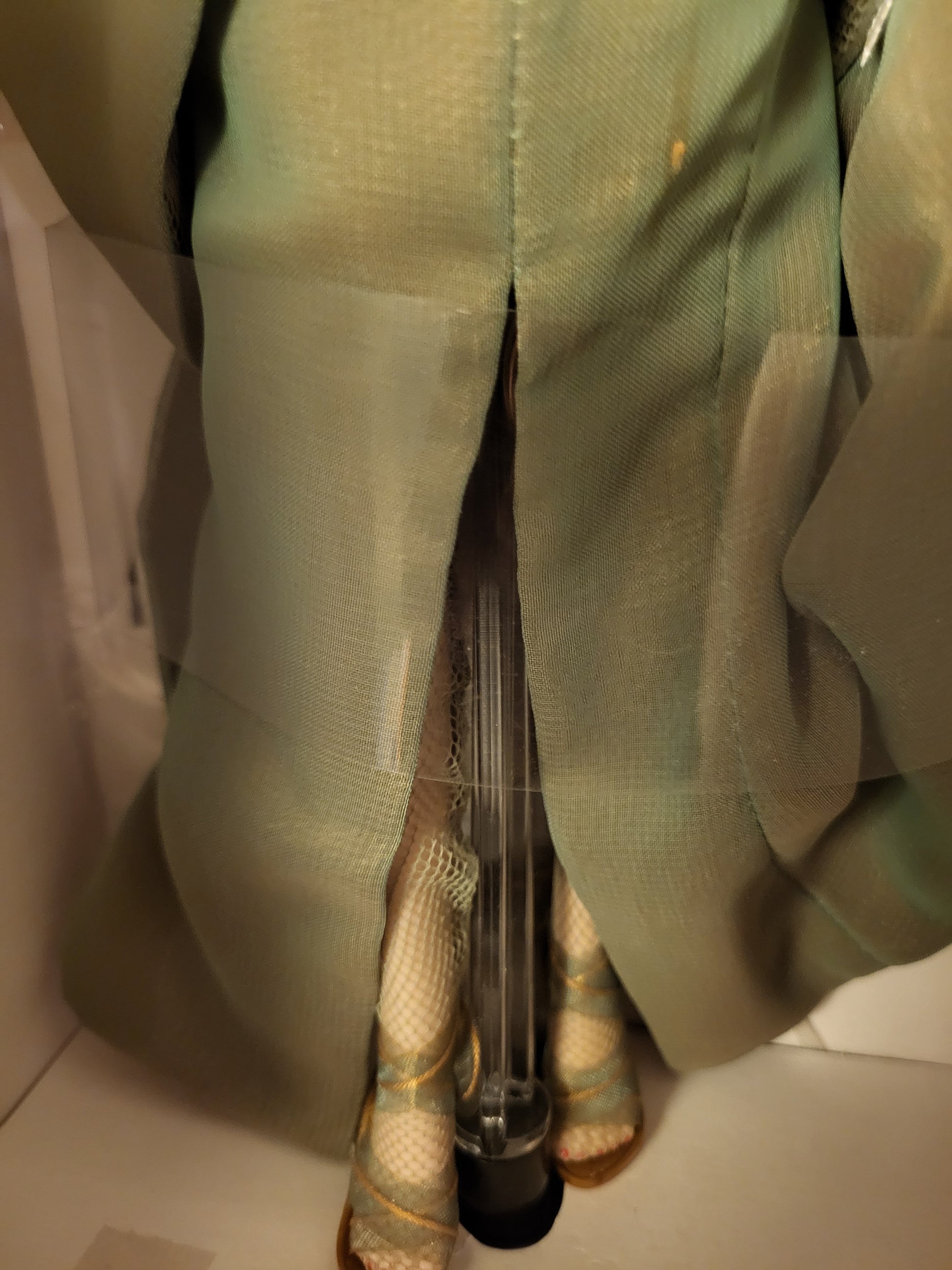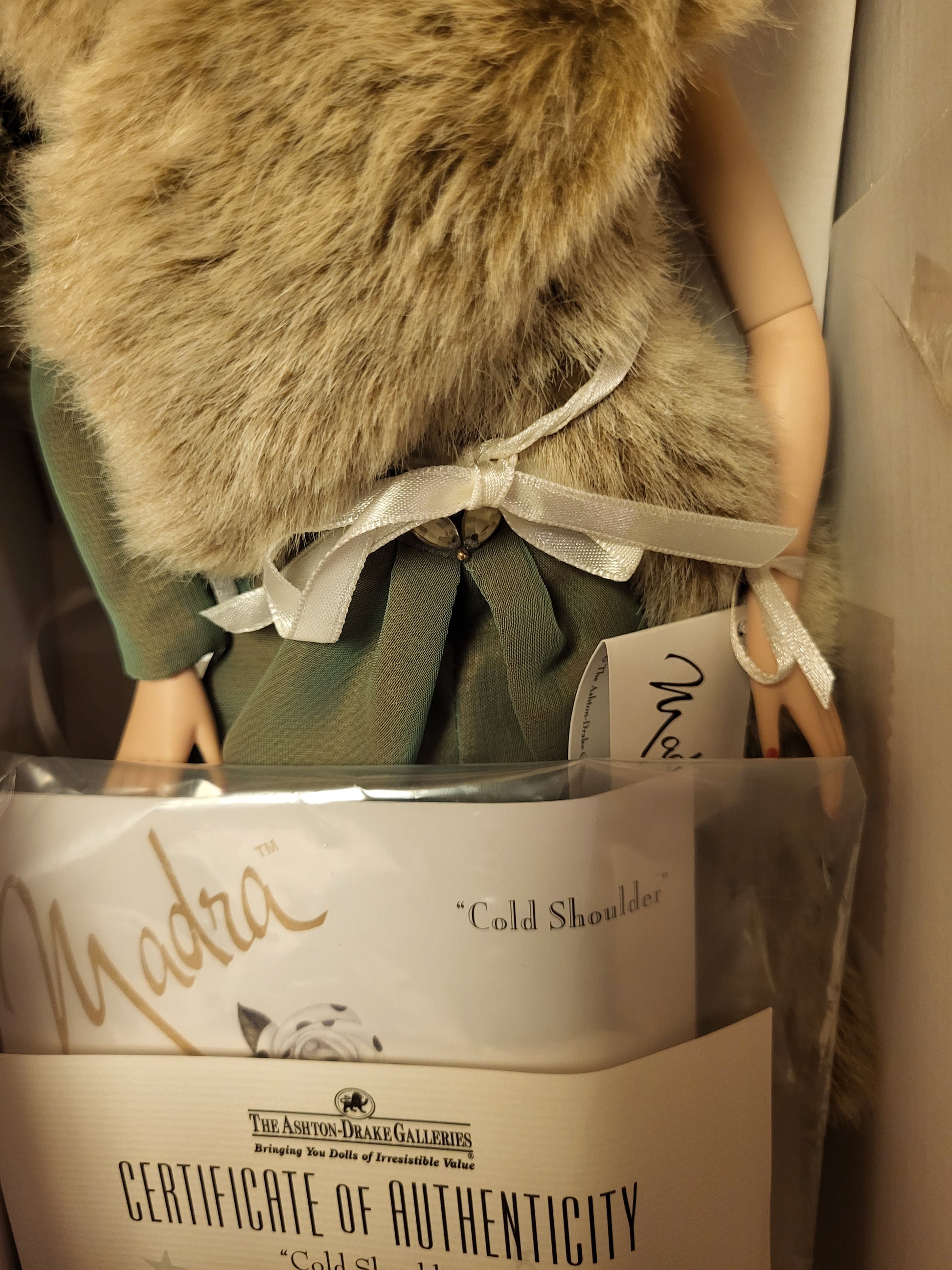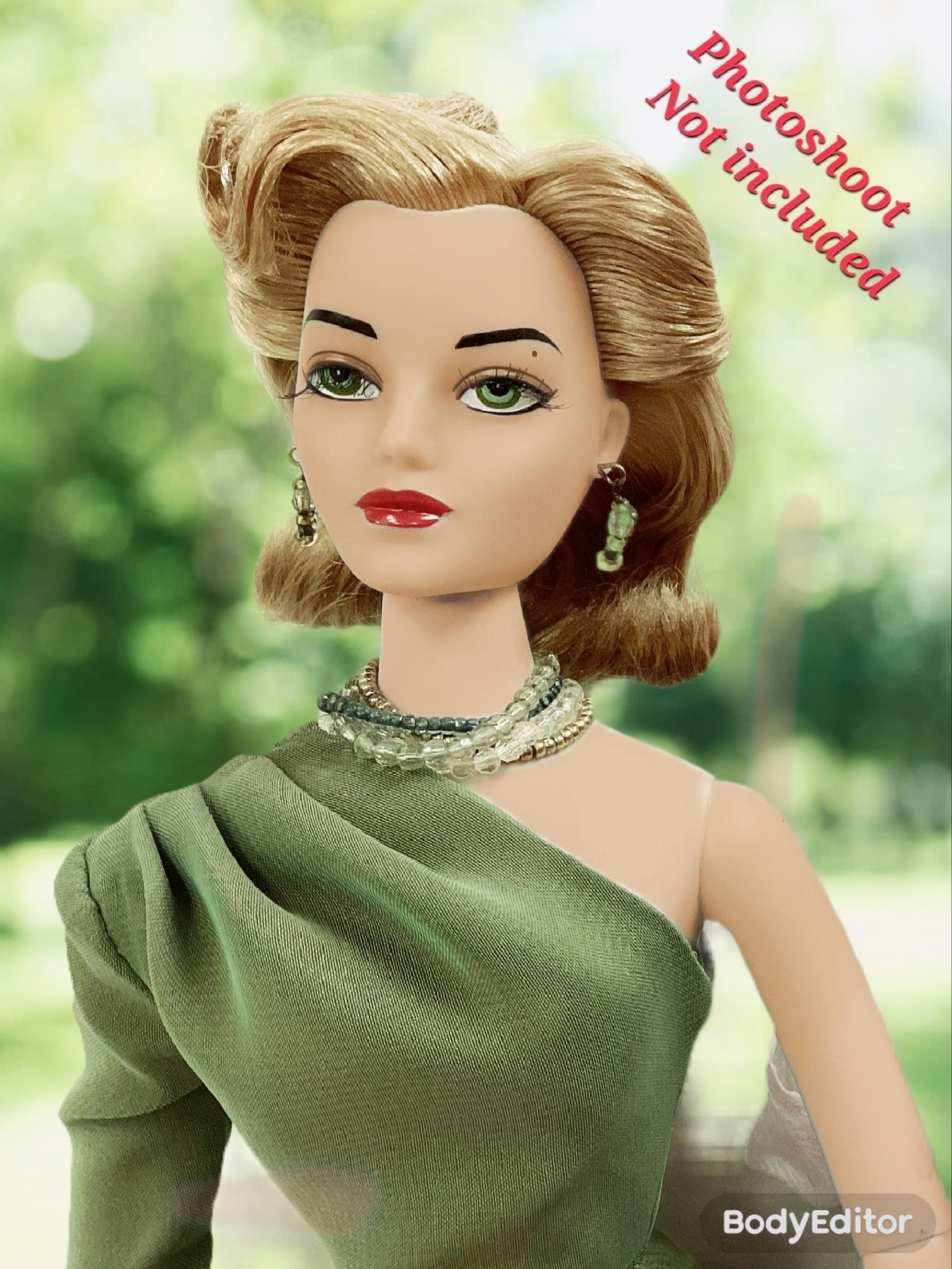 Madra doll with caramel blonde hair. Styled with side-swept bangs, chin length under-flip. Red lips, brown eyeshadow. She's outfitted in an Olive green crepe asymmetrical shouldered gown. Accessories incl. "Fur" stole, fishnet stockings, and a gold clutch purse.