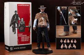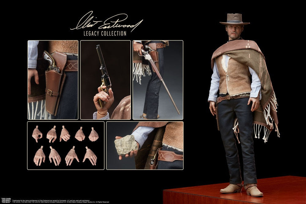 The Good, The Bad, and The Ugly – The Man with No Name 1/6 Scale Figure is the first in the new Clint Eastwood Legacy Collection. The figure stands at 12″ tall, includes a rock, a pistol, a rifle, multiple interchangeable hands, and a fabric outfit.