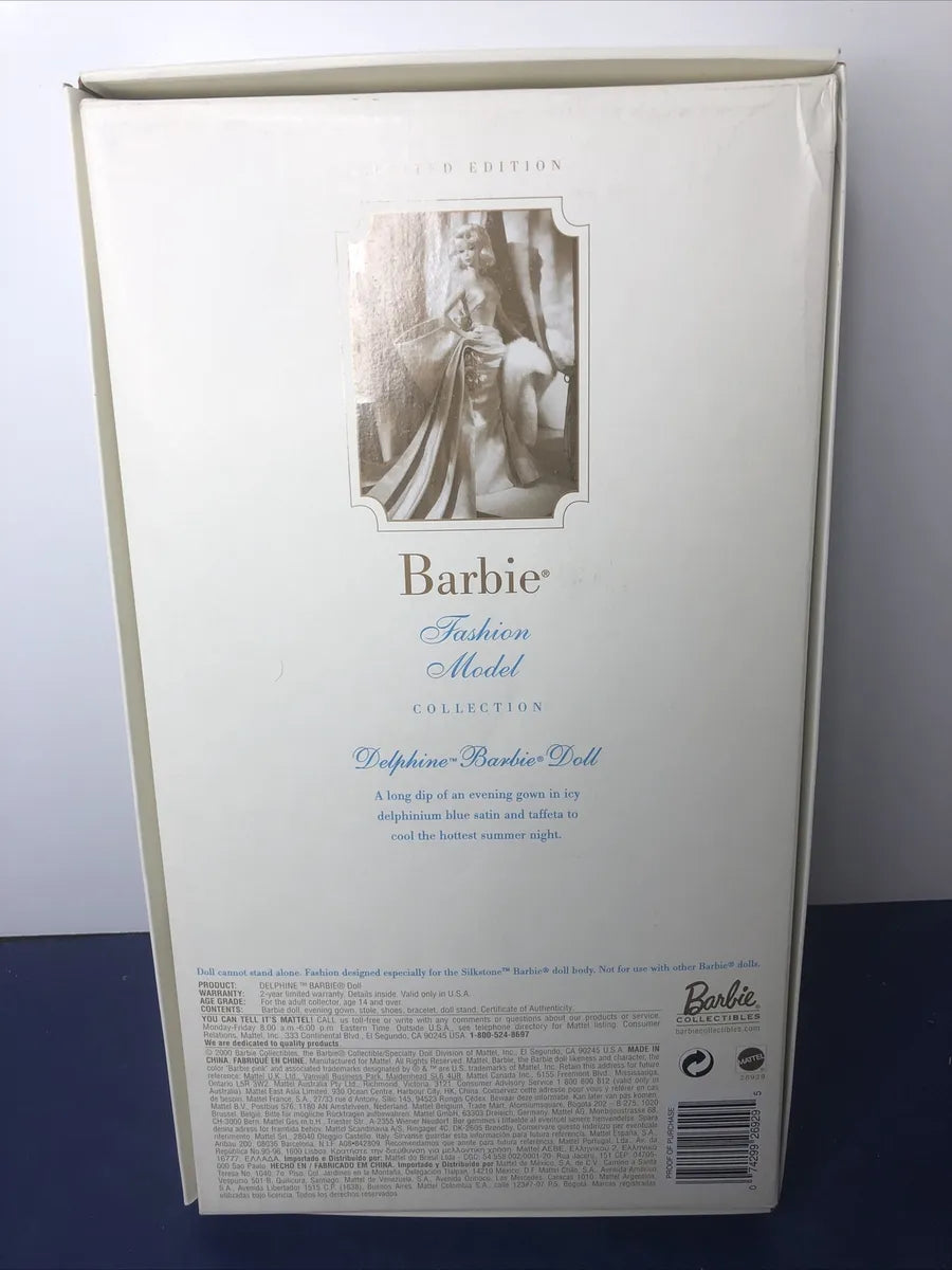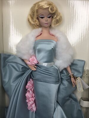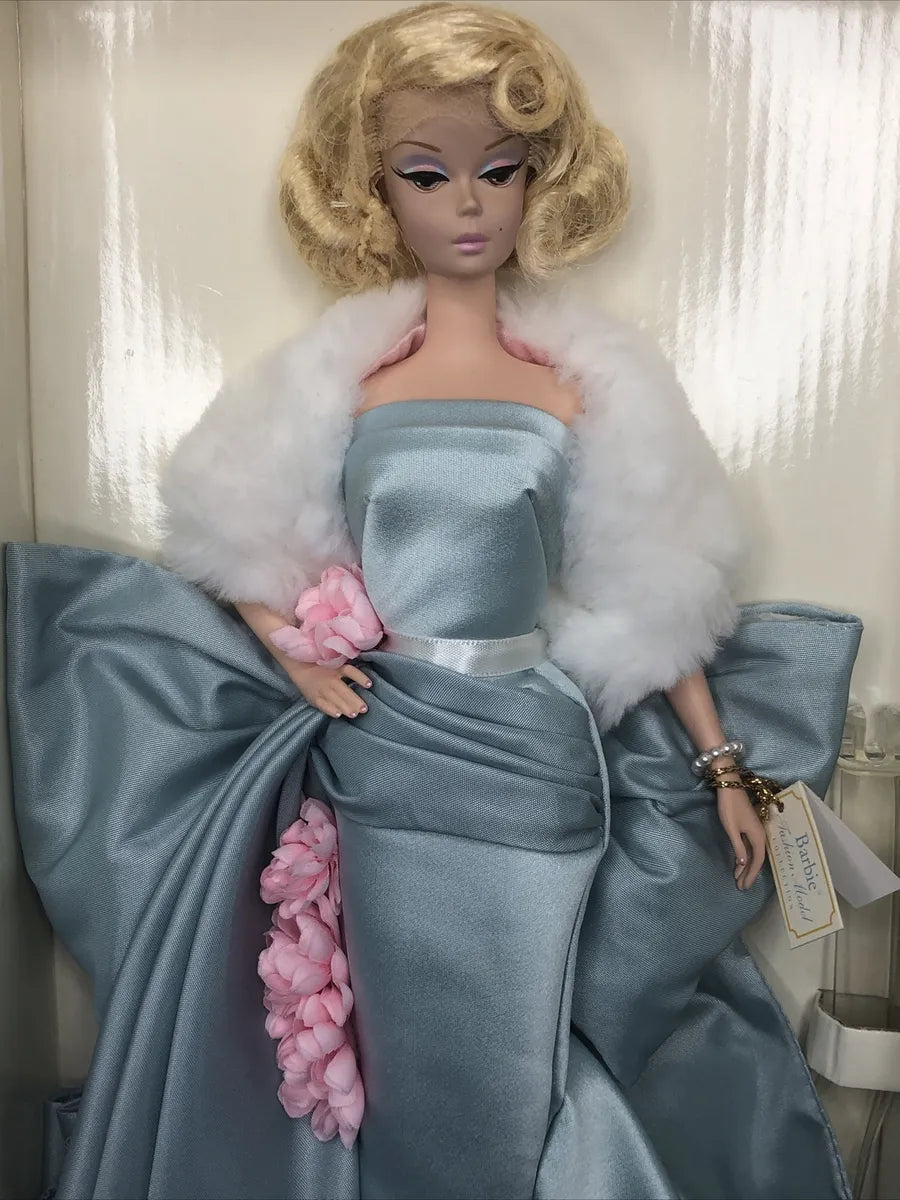 Delphine Barbie Doll Limited Edition Silkstone Fashion Model Collection 26929 Delphine Barbie® doll embodies the ultimate expression of style and elegance in a strapless evening gown in pale turquoise taffeta with a dramatic bow, draped train, and delicate pink flower accents. Her white faux fur stole lined in pink satin gives her stunning ensemble the final glamorous touch.