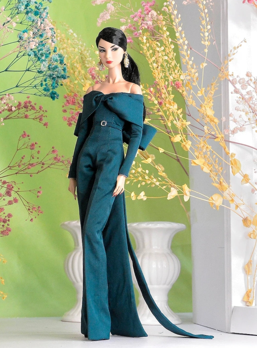 Custom Tailored for Poppy Parker Dolls: Teal green jumpsuit in silk, with bow detail at the back and zipper closure.This item is handmade using high quality fabrics and all lined!