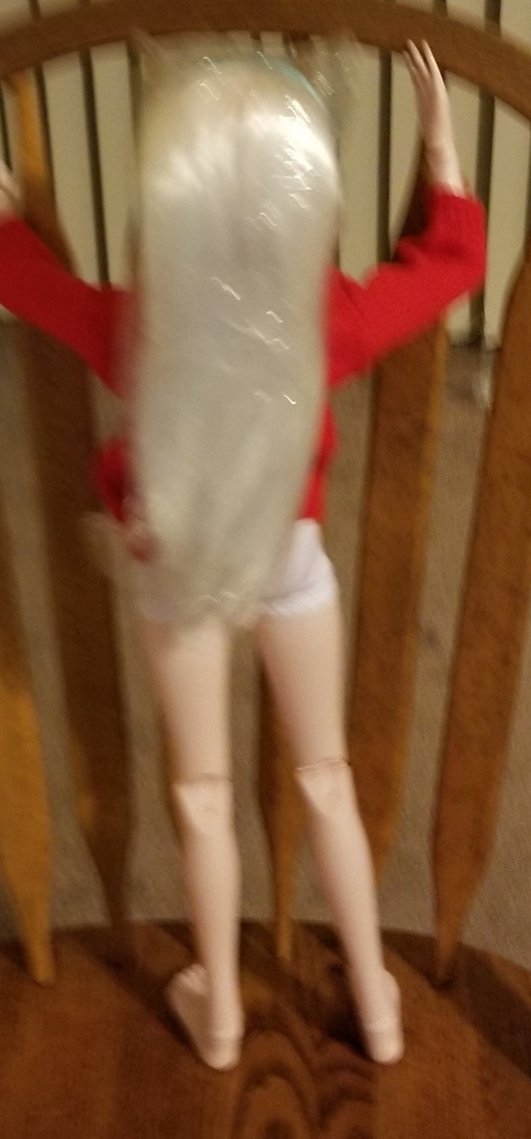 Our High School Sweetheart is Sky, an incredibly pretty 60cm 21 movable jointed BJD with white-blond and blue ombre hair. She's dressed for the winter sock-hop in a preppy red plaid skirt, a red sweater. black and white socks, and Christmas red hat and scarf, and white boots.