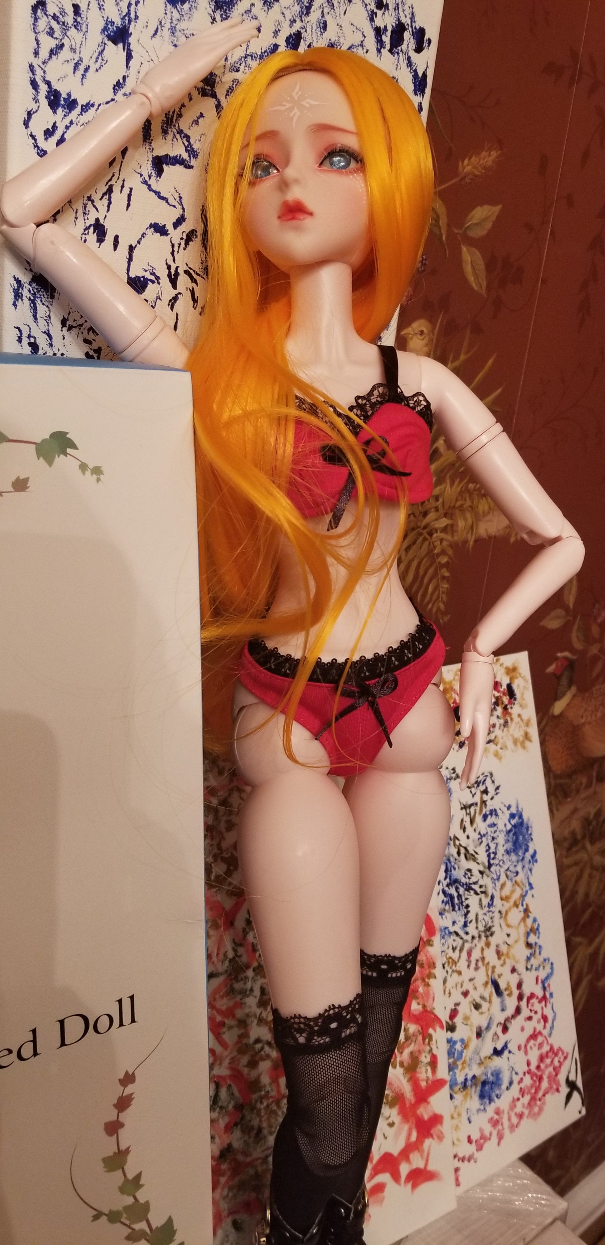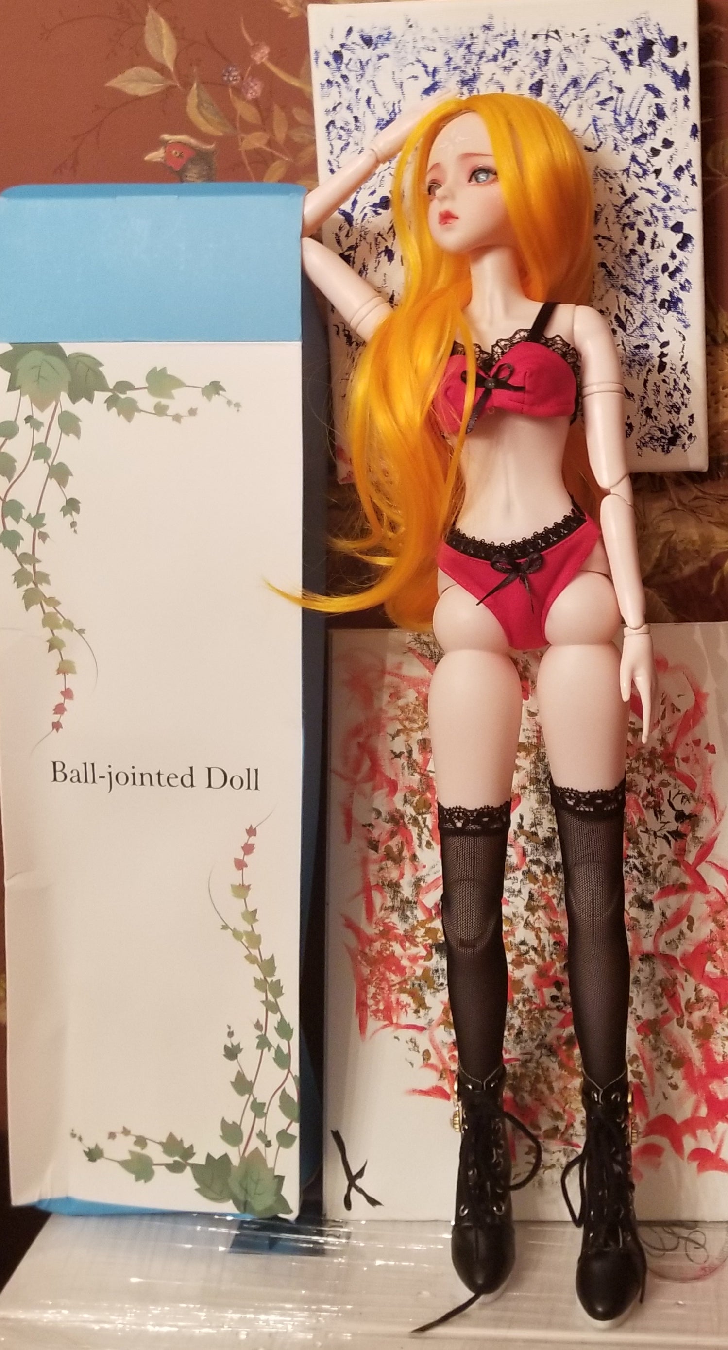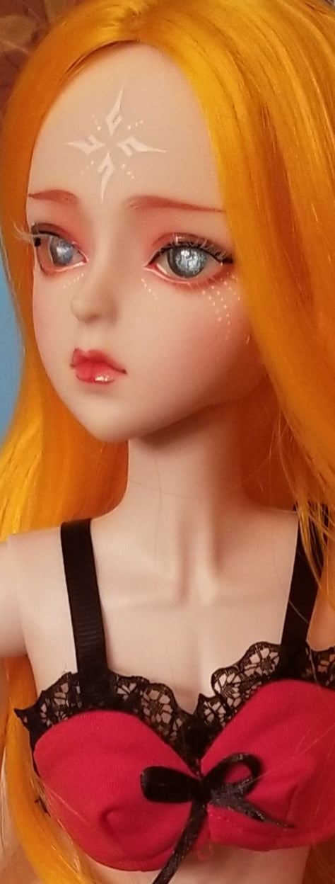 Introducing "Kailee”, a beautiful full package 1/3 BJD SD Doll. This gorgeous doll has the WOW factor any collector would want to add to their collection. She has flaming orange-blond hair (wig) as well as long blonde lashes and lovely painted lips. She's wearing red/black bra & panties with black nylon stockings and black boots trimmed in white and hanging jewel.