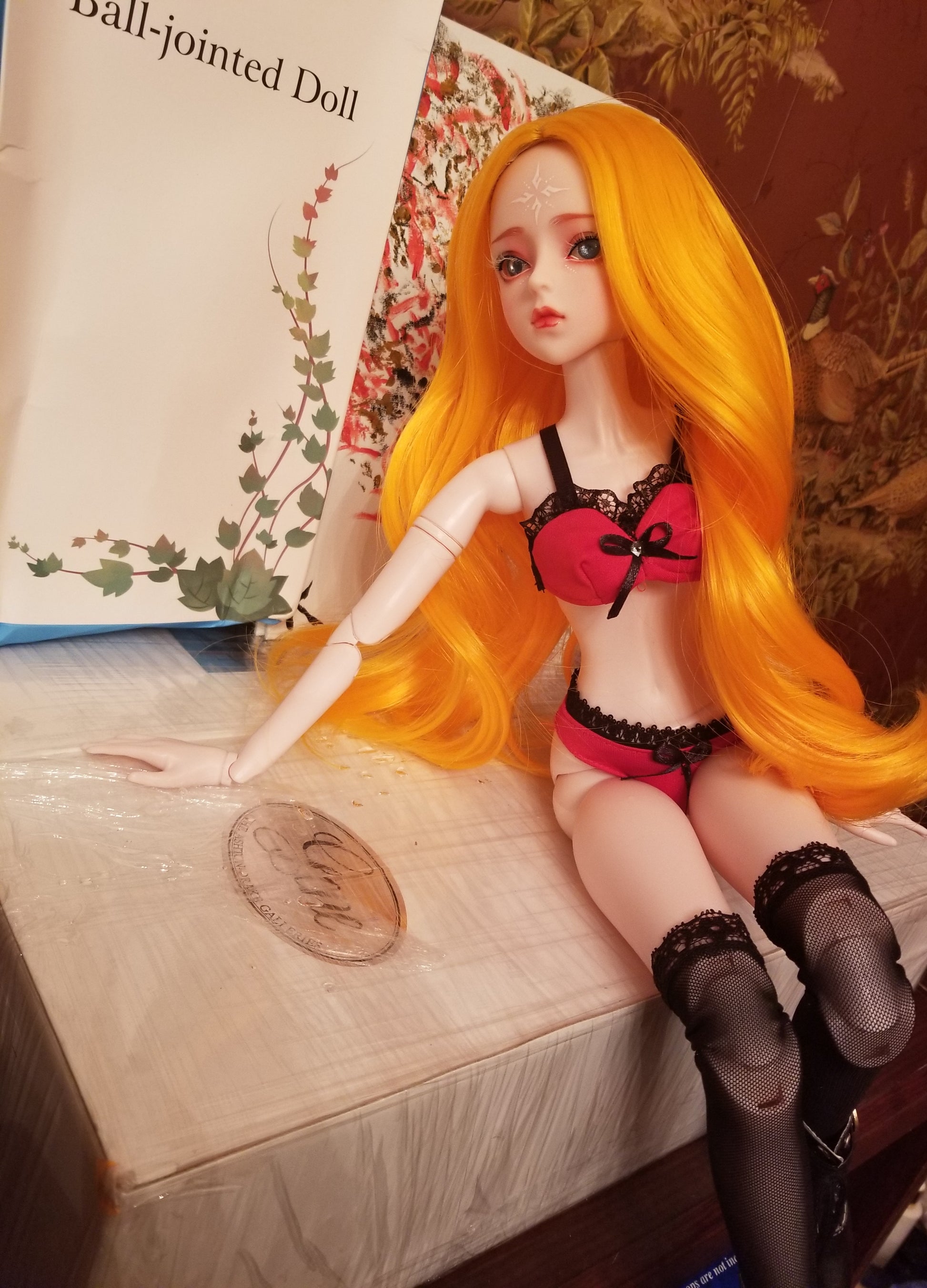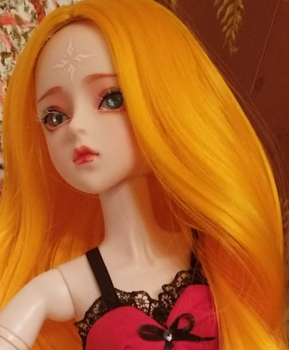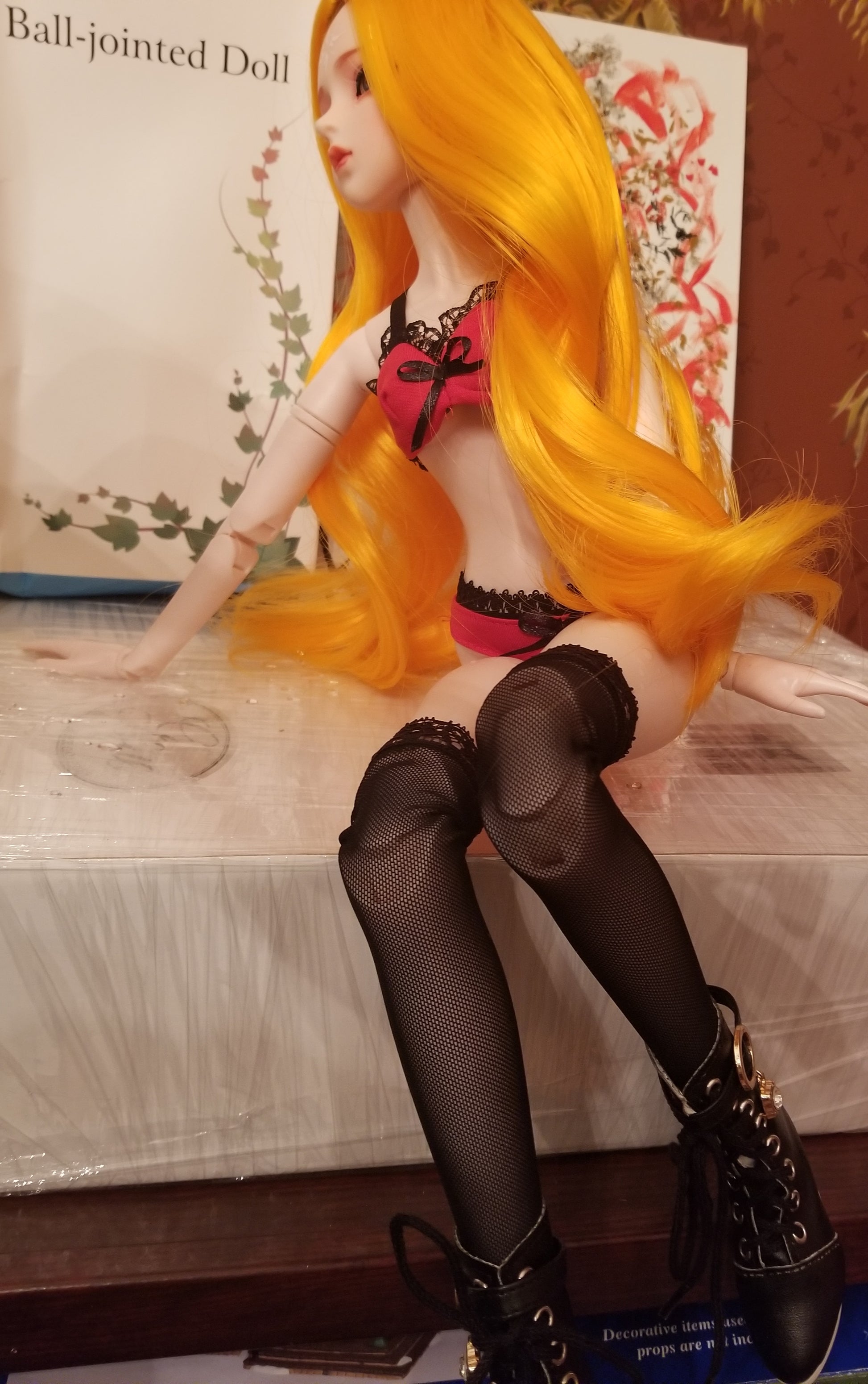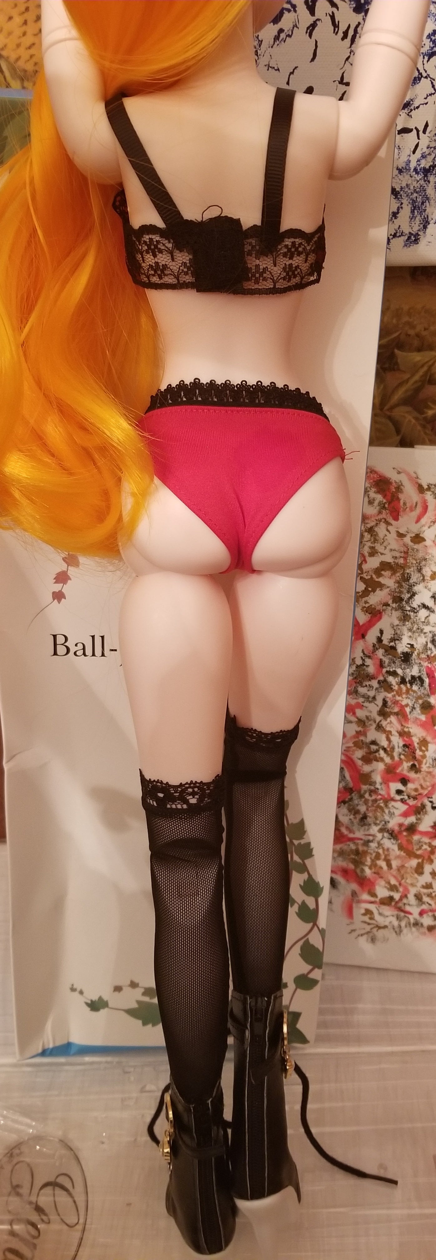 Introducing "Kailee”, a beautiful full package 1/3 BJD SD Doll. This gorgeous doll has the WOW factor any collector would want to add to their collection. She has flaming orange-blond hair (wig) as well as long blonde lashes and lovely painted lips. She's wearing red/black bra & panties with black nylon stockings and black boots trimmed in white and hanging jewel.