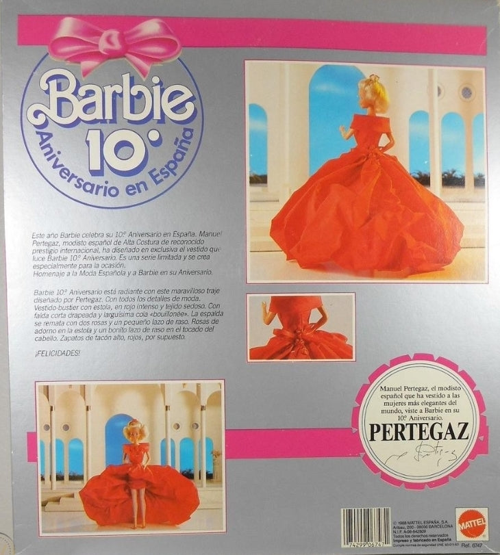 Les créations du grand créateur de mode Manuel Pertegaz (ou simplement «Pertegaz») ont été portées par certaines des femmesles plus célèbres au monde, telles que Jackie Kennedy, Audrey Hepburn et la reine Sofiad'Espagne »et Barbie ! Pertegaz a conçu la jolie robe rouge en exclusivité pour Barbie 10th(dixième) Anniversaire (1988).