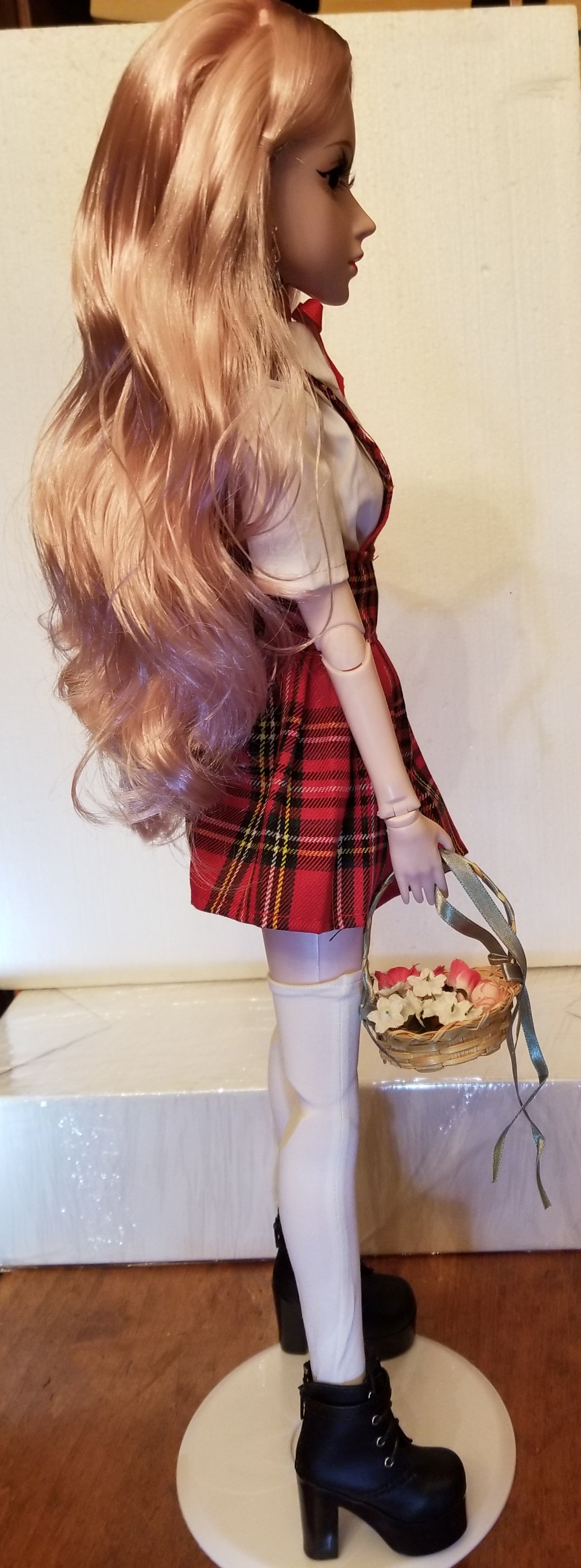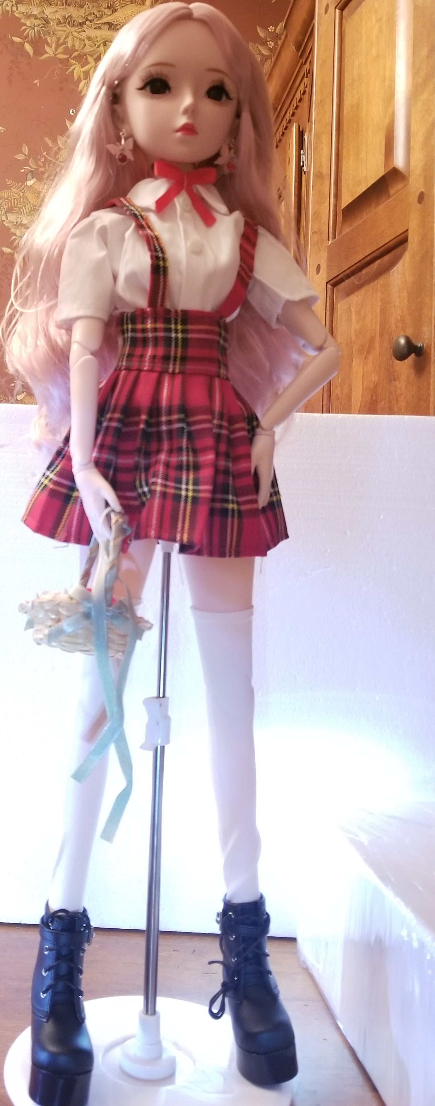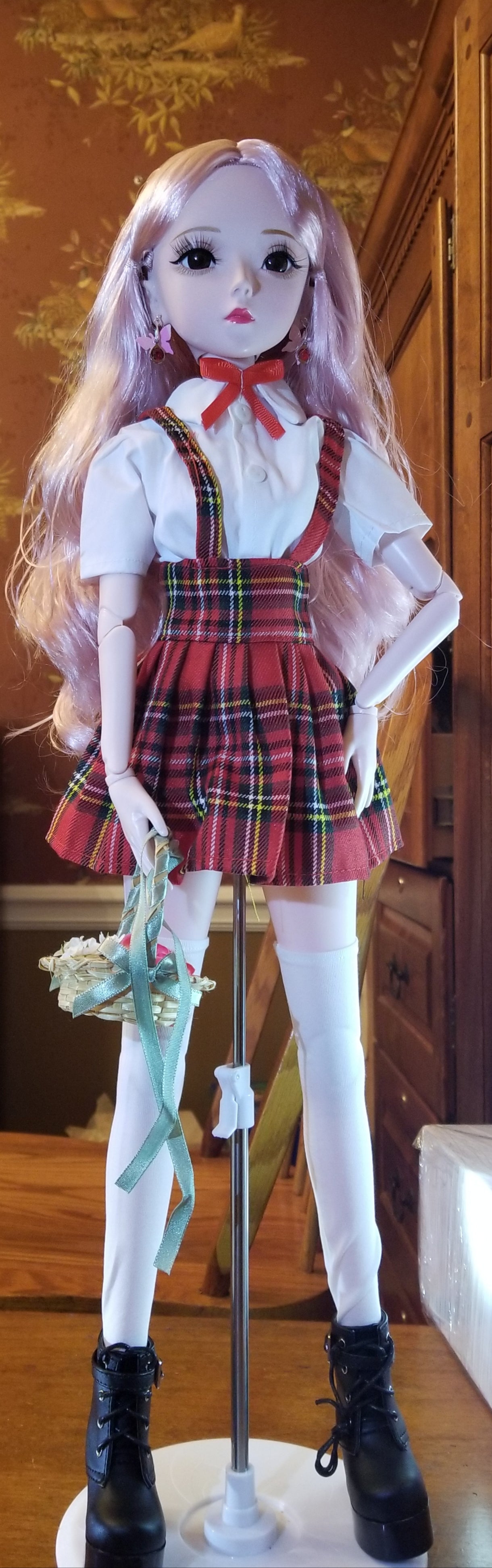 The "Pink Rose" is a beautiful full package 60cm (1/3) BJD Doll, SD. She has rooted hair, long lashes and sparkling red drop earrings with a butterfly background. She's wearing a Red Plaid Jumper & White Shirt with a Red Bow Tie, White Panties, White Thigh-high Stockings and Black Leather-like Laceup Shoes that also have a zip back.