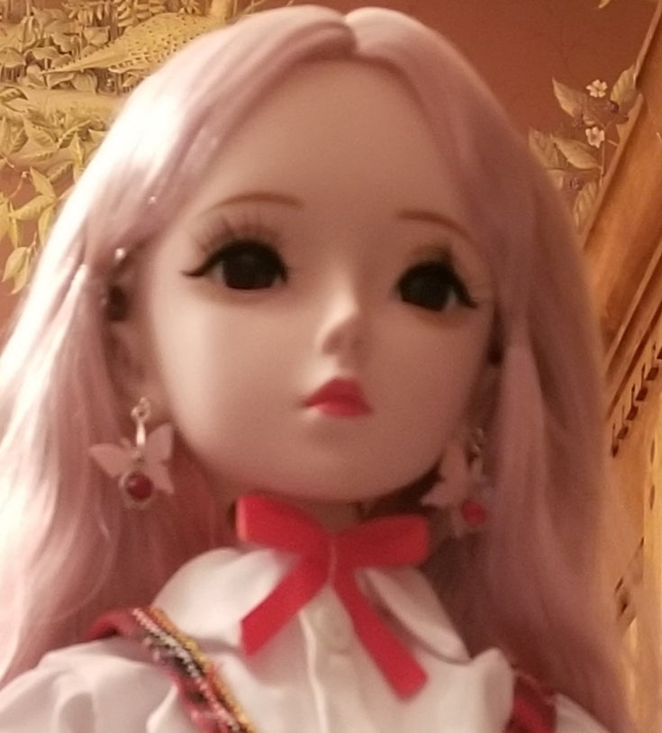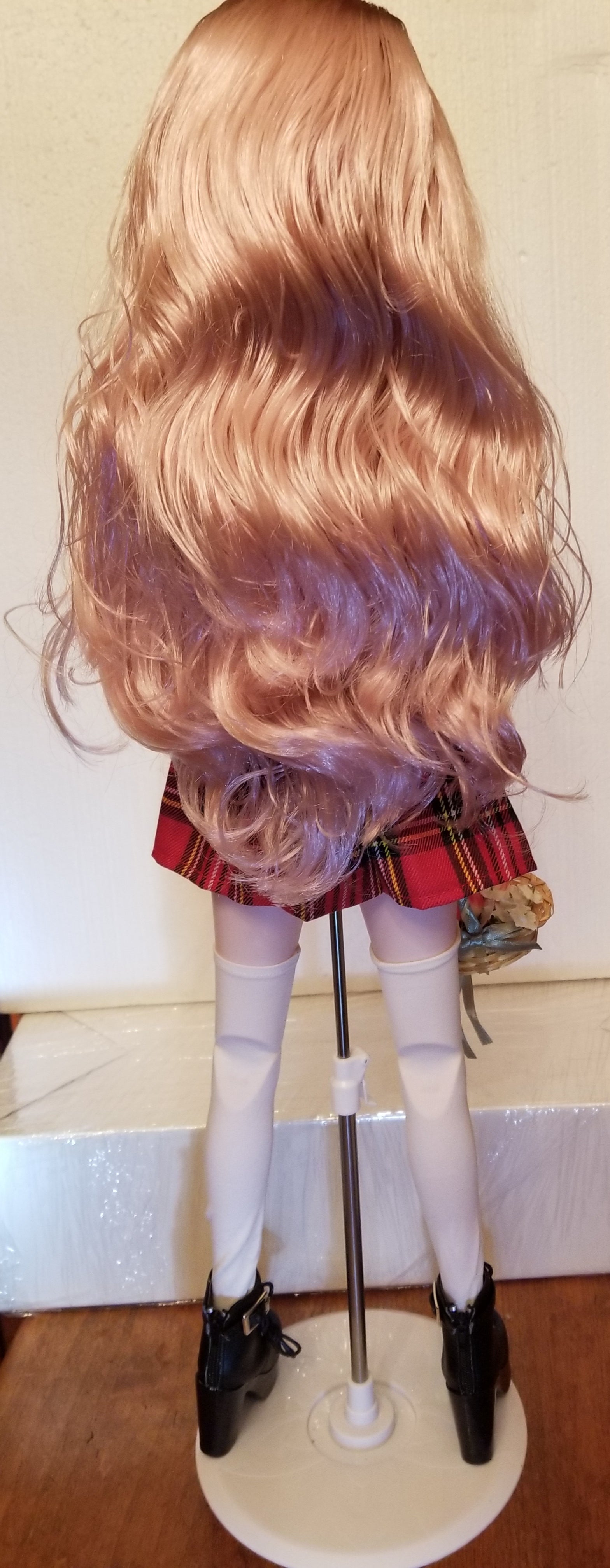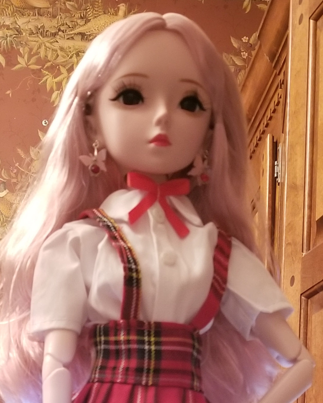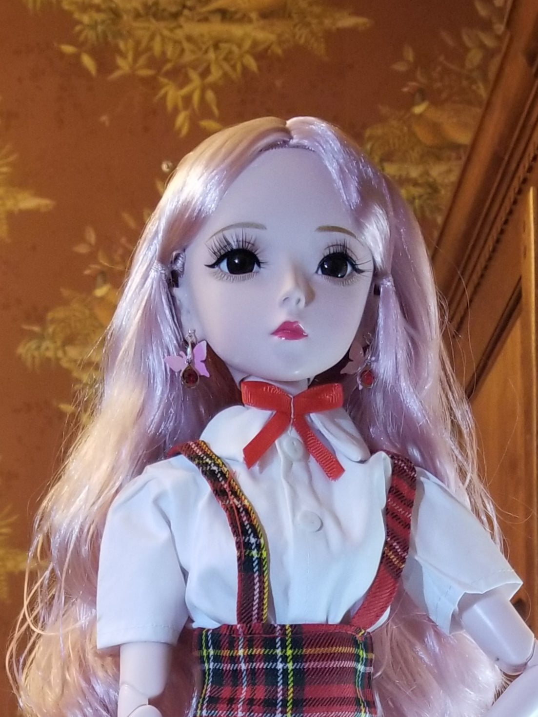 The "Pink Rose" is a beautiful full package 60cm (1/3) BJD Doll, SD. She has rooted hair, long lashes and sparkling red drop earrings with a butterfly background. She's wearing a Red Plaid Jumper & White Shirt with a Red Bow Tie, White Panties, White Thigh-high Stockings and Black Leather-like Laceup Shoes that also have a zip back.