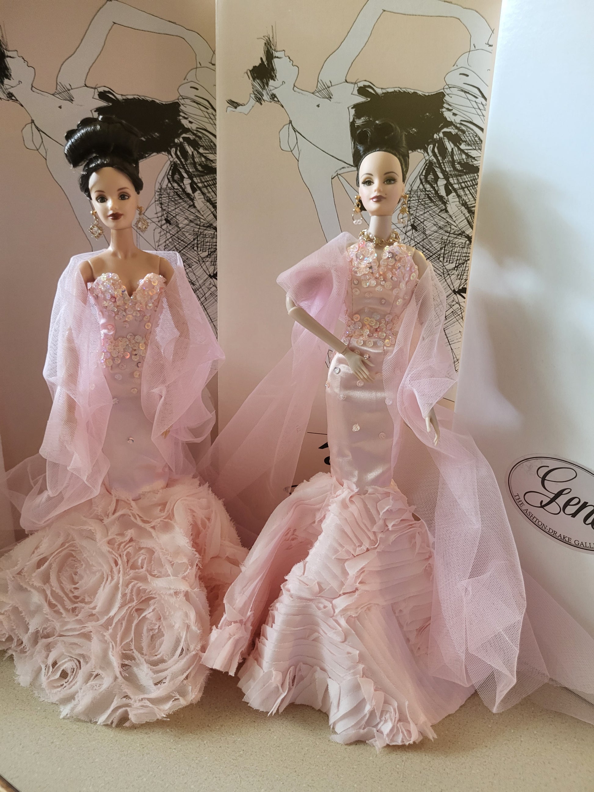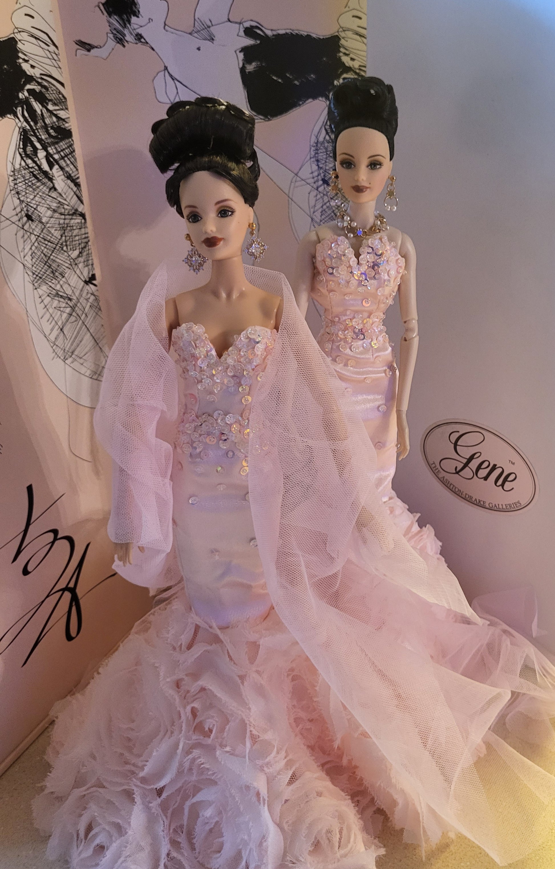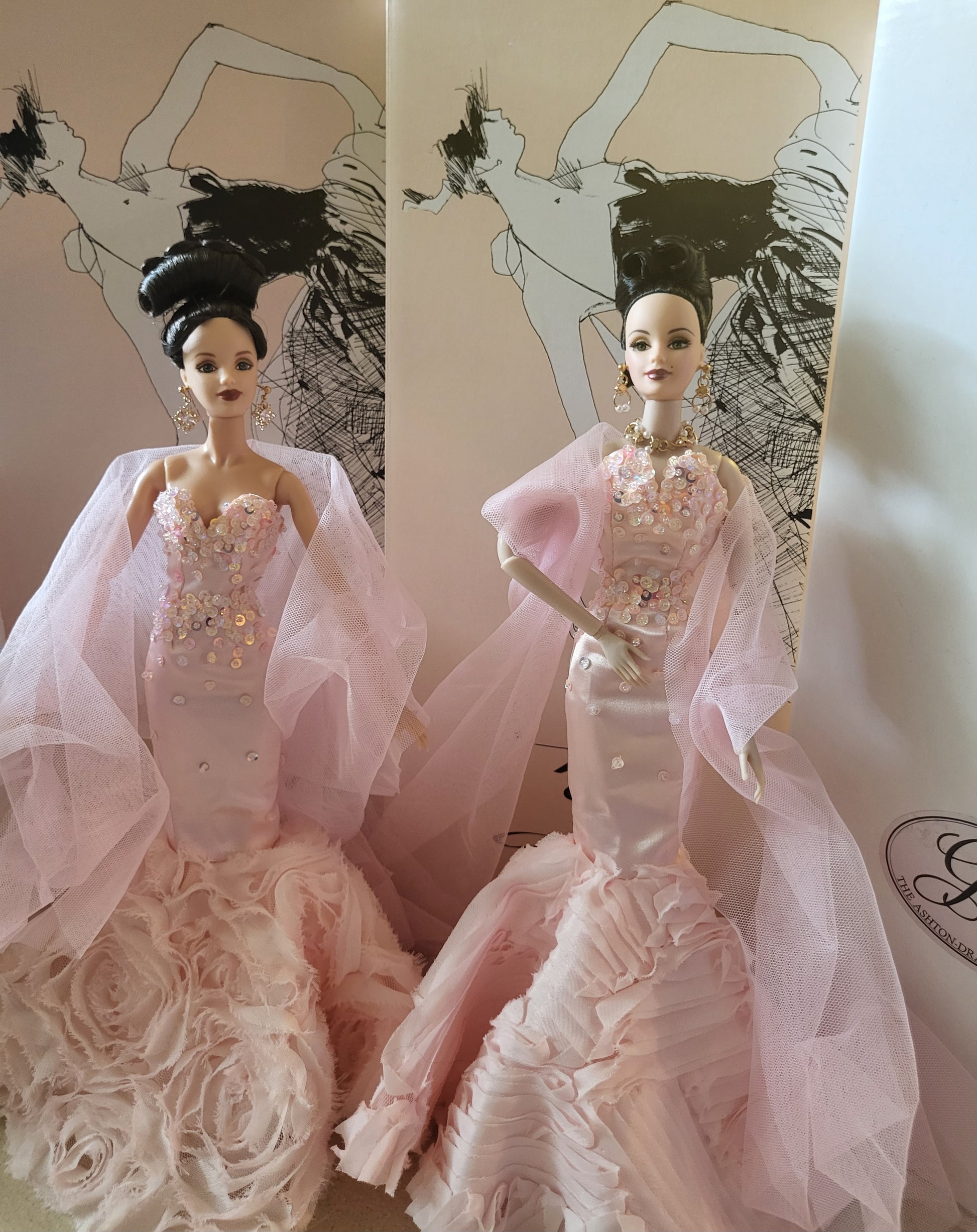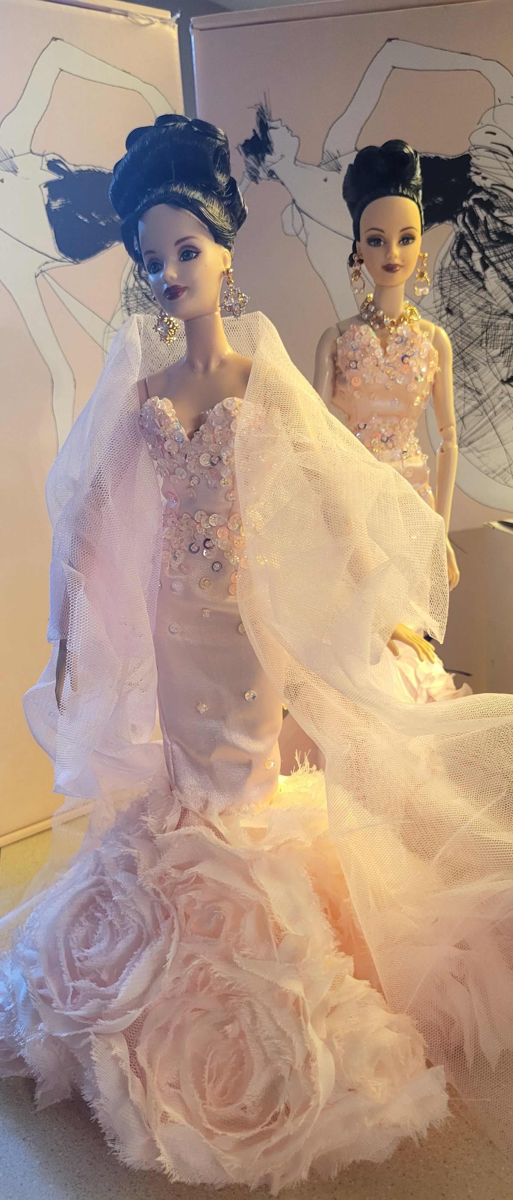 Sequined Pink Mermaid Gown modeled on 12-12.5" Kissmela BJD bodies. Gown fits Barbie / Fashion Royalty / Kissmela.